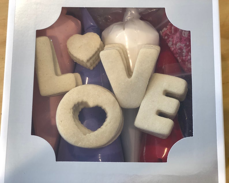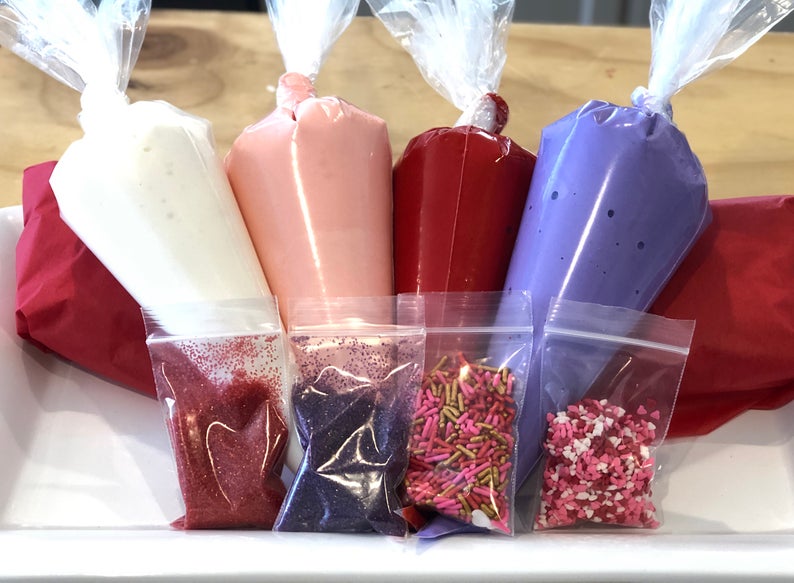 You'll receive 15 undecorated sugar cookies, 4 pastry bags of vanilla flavored royal icing (red, white, pink and purple) and 4 baggies of sprinkles/sanding sugars. These cookies are undecorated and the kit has everything you need to spend an afternoon decorating cookies.